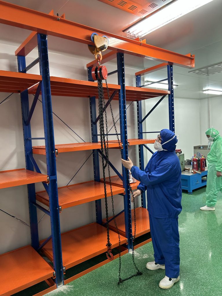 無塵生產(chǎn)車間采用的是常規(guī)模具存放方式,模具不接觸托盤,模具更換保養(yǎng)后直接配合工字鋼天車存放在模具架上;